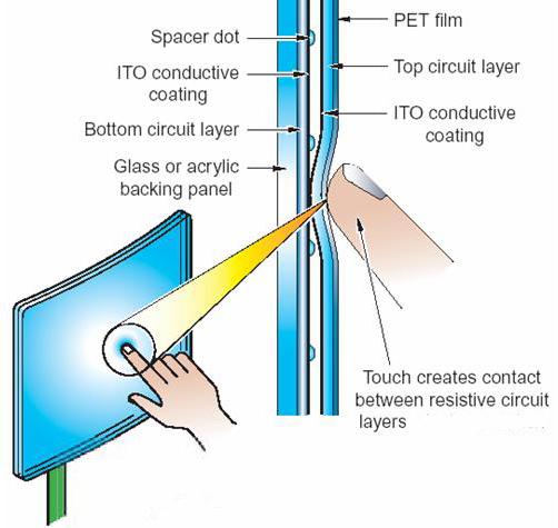 電阻式:從目前的推廣應(yīng)用來(lái)看,電阻式觸摸屏是占主導(dǎo)地位的觸摸技術(shù)。它由玻璃面板,銥錫氧化物(ITO)電阻涂層組成,并帶有導(dǎo)電涂層的護(hù)板,沿著邊緣有銀色的總線條。兩個(gè)層之間用絕緣小點(diǎn)隔開。觸摸屏幕時(shí),護(hù)板彎曲與玻璃上的涂膜相接觸(圖1)。