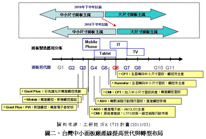 2011年是中小尺寸面板產(chǎn)線的轉(zhuǎn)型之重要年度,由于面板廠朝向更高世代生產(chǎn)大尺寸液晶面板更具有規(guī)模效益,故目前電視用面板主流切割世代廠走向7~8代,進(jìn)而開啟6代以下開始大量生產(chǎn)中小尺寸面板逐漸成為主流。同時,走向觸控面板的生產(chǎn)制造結(jié)合,亦成為共同走向。