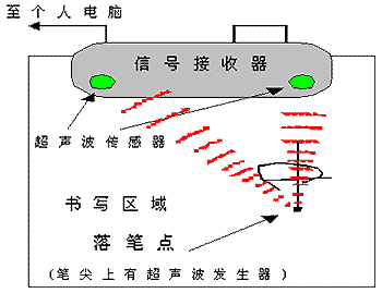 超聲波技術(shù)的原理是:利用超聲波的傳輸速度較慢的特性,根據(jù)超聲波發(fā)射到接收時間計(jì)算出發(fā)射點(diǎn)到接收點(diǎn)的距離。使用在平面定位上的原理采用的是在屏幕的一邊放置兩個按固定距離分布的超聲接收裝置,用于定位的筆是一個超聲波發(fā)射器,當(dāng)筆移動在屏幕的表面時,所發(fā)射的超聲波沿屏幕表面被接收器檢測到,由收到超聲波的時間可以換算出筆與兩個接收器的距離。采用三點(diǎn)定位的原理,即根據(jù)三角形已知三個邊長可以確定筆所在的頂點(diǎn)原理,計(jì)算出筆所在的位置坐標(biāo)。是一種測距定位模式。