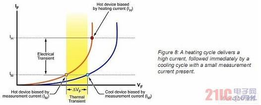 注意,當(dāng)PN結(jié)前向電流突然被停止(在測試過程中),不可避免的發(fā)生電瞬態(tài)現(xiàn)象。這個(gè)瞬態(tài)現(xiàn)象會(huì)持續(xù)很短的一段時(shí)間,在這段時(shí)間內(nèi)前向電壓的改變無法描述LED芯片的溫度的改變。因此,在進(jìn)行測量時(shí)必須給電瞬態(tài)現(xiàn)象消失留有一個(gè)時(shí)間上的延遲。