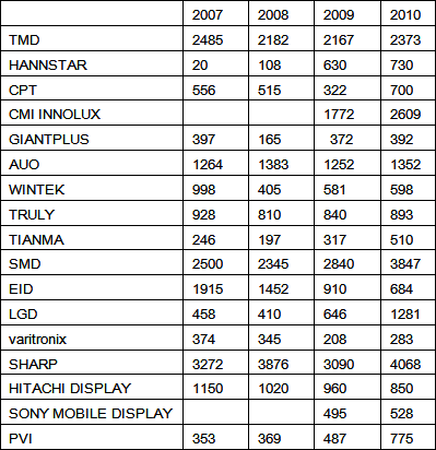 最后,中小顯示屏行業(yè)在一年內也經歷了比較大的變動。華映(CPT)和彩晶(HANNSTAR)徹底轉型為中小顯示屏廠家。CPT在2010年出貨量高達3.52億片,比2009年增長135%;HANNSTAR在2010年出貨量高達2.48億片,比2009年增長505%。雖然出貨量大增,但是平均單價不高,毛利低。加上TFT-LCD生產線的高額折舊費用,這兩個廠家還處于虧損的泥潭之中。