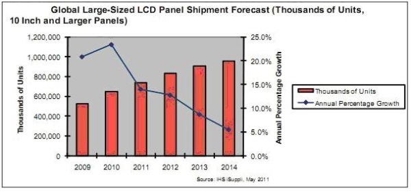 IHS iSuppli公司的研究顯示,第一季度電視、臺式電腦顯示器和筆記本電腦的消費(fèi)需求低迷,將導(dǎo)致2011年全球大尺寸液晶面板出貨量增長速度低于2010和2009年。2011年全球大尺寸液晶面板出貨量將僅增長14%,而2010和2009年分別是23.4%和20.8%。今年的單位出貨量將為7.4億塊,高于2010年的6.493億塊。