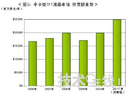 圖3表示中小型液晶市場(chǎng)過(guò)去5年內(nèi)的業(yè)績(jī)與今年的供貨額預(yù)測(cè)。手機(jī)及數(shù)碼相機(jī)等使用的中小型FPD因價(jià)格不斷降低,市場(chǎng)范圍逐步擴(kuò)大,導(dǎo)致中小型液晶 市場(chǎng)的供貨額與供貨量增長(zhǎng)幅度相比,持續(xù)出現(xiàn)了低增長(zhǎng),因2008年雷曼危機(jī)后消費(fèi)低迷,這一市場(chǎng)陷入了供貨額大幅減少的局面。在此期間,許多中小型液晶 廠商都有過(guò)力圖通過(guò)縮小業(yè)務(wù)而生存下去的辛酸經(jīng)歷,包括同行業(yè)廠商間的業(yè)務(wù)撤銷與合并以及淘汰設(shè)備等。