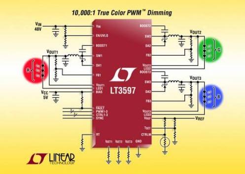 LT3597 采用 3 個獨(dú)立的 400mA、60V 內(nèi)部開關(guān),以提供降壓型恒定電流源。內(nèi)部降壓型轉(zhuǎn)換器運(yùn)用自適應(yīng)反饋環(huán)路調(diào)節(jié)輸出電壓,使其略高于所需要的 LED 電壓,以確保最高效率。如果任何一串 LED 串出現(xiàn)了開路或短路故障,那么 LT3597 就繼續(xù)調(diào)節(jié)其它 LED 串,并向 FAULT 引腳發(fā)出信號。其他特點(diǎn)包括基于節(jié)溫和 / 或 LED 溫度使 LED 電流降額以及在停機(jī)時斷接 LED。