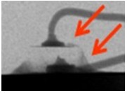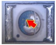 2. 變色:這類失效是指LED不點亮的狀況下,外觀顏色或膠材透明度與新品不同,用肉眼即可看出,通常在產品使用一段時間或在做完可靠度試驗后發(fā)生。一般說來,變色區(qū)域大致可區(qū)分為發(fā)生在導線架或封裝膠材兩類,若發(fā)生在導線架,通常是因為表面與環(huán)境中的化學物質發(fā)生反應,如氧化或硫化,要分辨屬于哪種需仰賴成份分析,可使用的儀器包含有EDS(Energy Dispersive X-ray Spectroscope)、XPS(X-ray Photoelectron Spectrometer)、AES(Augur Electron Spectroscope)等等。若是封裝用的膠材發(fā)生變色,則屬于高分子材料的劣化現象,如環(huán)氧樹脂易受高溫或是紫外光影響而變黃,因此白光LED多改采矽膠取代之。分析此類失效應特別留意,因膠材本身有一定的透明度,有時變色的導線架因被膠材蓋住而誤判為膠材變色,引導至錯誤的改善方向。