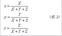CIE XYZ 1931色度系統(tǒng)中的色坐標(biāo)x, y, z與三刺激值XYZ之間的關(guān)系式如下: