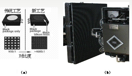 如圖1所示,(a)左側(cè)為傳統(tǒng)工藝的LED發(fā)光管。一般為黑色面碗LED發(fā)光管,管芯為白色。(a)右側(cè)為Barco公司采用新技術(shù),使用黑色管芯,有效提高了對比度指標。(b)圖為采用新工藝的P4間距SMD顯示屏模組。