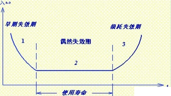 對可靠性的研究不能只停留在數(shù)據(jù)的測量和壽命的推算上,重要的是利用有效數(shù)據(jù)進行失效機理的分析。器件的失效分為早期失效,偶然失效,耗損失效三個階段,服從浴盆分布曲線。如圖1所示: