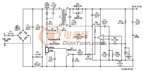 圖1所示為一個(gè)典型的20 V、14 W恒壓(CV)、恒流(CV)輸出的電源電路。LED陣列的光輸出量與所流經(jīng)的電流量成正比。因此,LED驅(qū)動(dòng)器應(yīng)具有恒流輸出,而不是恒壓輸出。在本設(shè)計(jì)中,DC輸出未與AC輸入隔離,因而LED陣列和外殼應(yīng)與用戶安全地隔離開來。