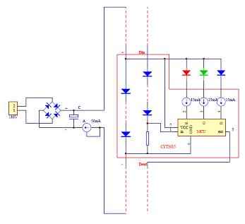 在此電路中,芯片供電利用壓差,電勢一級級的往下降,形成了梯式壓降,故而稱壓階傳輸。其實,信號傳輸也利用了壓階傳輸?shù)姆绞剑酒c芯片之間的信號線串接了壓階管,這樣做的目的是經(jīng)過每一級后,降低一階信號電勢,使該級芯片的信號與地之間的電勢差保持正常工作的一個差值,否則,會因為相對電勢過大而燒毀芯片。我們可以注意到這個電路只要兩條線,一條供電,一條信號傳輸,供電的線是串行的,所以總線上的電流比較小,用較細(xì)的線就行了。電路的末端,用了一個CYT1A50,它可以使整個線路恒流。另一方面,由于它的端口耐壓也比較高,可以將電路上多余的壓降壓在這顆芯片上。