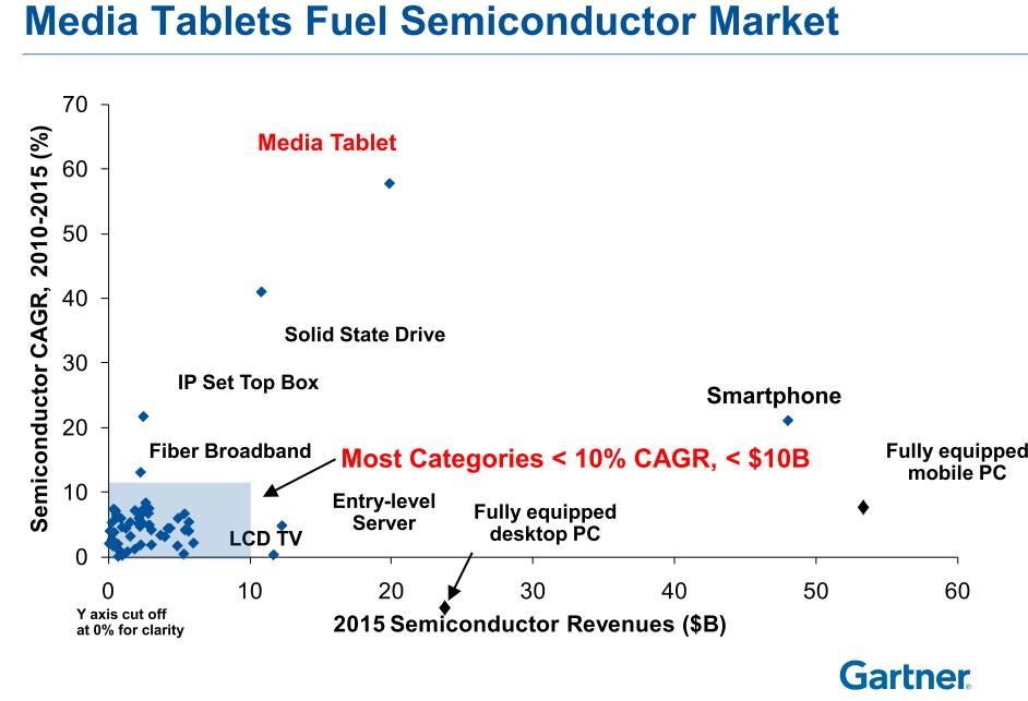針對平板媒體崛起對供應(yīng)鏈的影響,李輔邦表示,直至2013年,半導(dǎo)體產(chǎn)業(yè)營收的成長有25%來自于平板媒體。Gartner預(yù)估, 2015年,平板媒體半導(dǎo)體總體有效市場將逾200億美元,成為半導(dǎo)體應(yīng)用第四大市場??扉W存儲器、無線通訊和觸控裝置將受惠于平板媒體的熱銷。