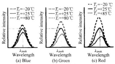 但從LED 的亮度特性圖3 可知,隨著環(huán)境溫度TC 的變化,L ED 的RGB 三基色的顯示亮度偏移狀況各不相同,B 的飄移較小,而R 的飄移較大,當(dāng)溫度超過80 ℃時,R 相對亮度的變化幾乎是常溫時的2 倍。這種變化完全破壞了常溫時設(shè)置的白平衡,使整個顯示屏的色度發(fā)生嚴(yán)重漂移,圖像質(zhì)量變差。RGB 三基色的相對亮度的偏移如圖4 示,可明顯看出,常溫時三基色的亮度狀態(tài)和在85 ℃及- 20 ℃時的相對亮度值,正是L ED 的溫度特性導(dǎo)致冬季和夏季顯示屏的圖像質(zhì)量變差。
