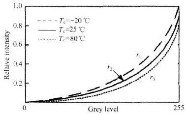但此方法將損失低灰度級的亮度,降低了圖像的灰度級,即降低了圖像顯示色彩。為了不減少低級灰度且保證對亮度的調(diào)整,提出一種針對每個溫度段采用不同的Gamma 參數(shù)來調(diào)整相關(guān)色彩亮度的技術(shù),以補(bǔ)償環(huán)境溫度對器件的影響。系統(tǒng)針對不同的RGB 的基色設(shè)置其獨立的Gamma 反校正參數(shù)。