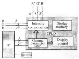 為了補(bǔ)償LED 因溫度引起的亮度變化,LED 顯示系統(tǒng)增加了亮度檢測電路。實驗發(fā)現(xiàn),以20 ℃溫度間隔對色彩進(jìn)行溫度補(bǔ)償時,能基本上滿足圖像的觀看質(zhì)量。為此,系統(tǒng)以常溫為基礎(chǔ),每隔20 ℃給出相應(yīng)基色的Gamma 校正參數(shù)。對于- 20 ℃~ + 80 ℃范圍,每個基色給出供5 種不同的Gamma 參數(shù)以補(bǔ)償亮度的變化。圖6 給出系統(tǒng)的溫度檢測電路和相應(yīng)的控制Gamma 參數(shù)的電路框圖。利用溫度傳感器DS18B20檢測環(huán)境溫度的變化,當(dāng)環(huán)境溫度到達(dá)設(shè)定溫度值時,通過微處理器的ARC 3 個I/ O 線輸出5 個溫度狀態(tài)中的某一狀態(tài)值給CPLD。在CPLD 內(nèi)部設(shè)有RGB 三基色(3 ×4 + 1 = 13)13 個(常溫時采用一個標(biāo)準(zhǔn)的Gamma 參數(shù)校正,在其他溫度下,每個基色一個校正參數(shù)) Gamma 值的參數(shù)表,從表查出分別對應(yīng)RGB 的3 個Gamma 值提供給亮度控制電路和顯示控制電路。