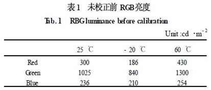表1 中,常溫的白場配色比例為1. 92 ∶6. 57 ∶1. 51。而當(dāng)溫度發(fā)生變化時,由于LED 的特性,使RGB 的亮度特性發(fā)生了嚴(yán)重的偏移,使白場的比例已完全偏離了常溫下的比例,使圖像在色彩發(fā)生了畸變。而采用本文的校正技術(shù)后,結(jié)果如表2 所示。