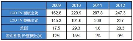 液晶電視整機(jī)出貨與面板出貨之間的差距 (單位:百萬片)