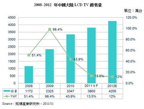 隨著2011年接近漸近尾聲,中國(guó)大陸LCD TV年銷售量預(yù)估將成長(zhǎng)13.5%,但與2009年的98.4%和2010年的43.9%成長(zhǎng)率相比,已不可同日而語。