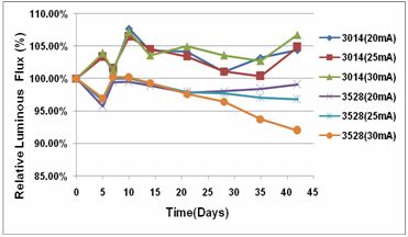 初始參數(shù)測(cè)試結(jié)果表明,在20mA電流驅(qū)動(dòng)下,3014LED的光通量比3528高,且其CCT集中度比3528LED好。另3014一般在30mA電流下驅(qū)動(dòng)使用,其光通量達(dá)到10~11Lm;如上節(jié)熱模擬顯示,3528LED散熱效果遠(yuǎn)不如3014LED,故其在大電流驅(qū)動(dòng)下,光通量必定會(huì)嚴(yán)重受到過(guò)高熱量的影響。因此相比水平散熱LED,垂直散熱LED具有不可比擬的優(yōu)勢(shì)。