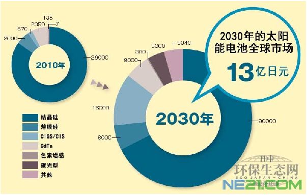 該調(diào)查的特點(diǎn)在于根據(jù)太陽能電池的不同種類進(jìn)行預(yù)測。轉(zhuǎn)換效率及性價比較高的結(jié)晶硅太陽能電池到2030年將擴(kuò)大到9萬億日元,約為2010年的3倍。約占整個市場的7成,依然是主流產(chǎn)品。