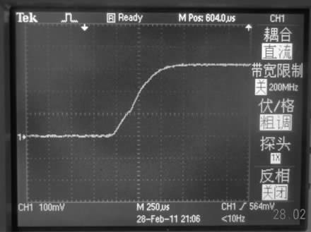 通過模擬可初步選擇40 mH 的電感作為驅(qū)動電路所用, 圖3 是用示波器采到的電壓波形圖, 此電壓是電路中串聯(lián)了一個20 Ω 的電阻上的電壓, 穩(wěn)定后電壓為340 mV, 即電路中電流為17 mA.因為實際電路中電流有損耗, 所以實際電流值比模擬電流值偏小, 但整個電流的變化趨勢與模擬基本一致。