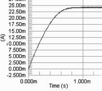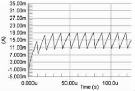 要保證PWM 周期小于電感的τ 時間, 因為若PWM 的周期大于τ, 則極有可能出現(xiàn)在PWM 的占空比變化的情況下, 電路中電流都能達到電感的飽和直流電流, 影響了對LED 電流調(diào)節(jié)。當C8051330 的時鐘頻率是25 MHz ,PWM 的周期的選擇對電流改變檔位的影響很大。若周期越大, 則PWM 占空比的檔位越多, 反之越少。擬用256 個檔位的占空比, 因此PWM 波的頻率應選擇在100kHz 以下,即周期在10 μs 以上,直流電感為10Ω, 此時電感值應選擇大于0.1 mH.圖2 分別是PWM 頻率為100kHz , 占空比為90%, 電感為0.1 mH、1 mH 和40 mH 時電路電流值的模擬結果。