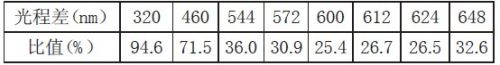 由圖1 可總結(jié)出,在有效光程差較小時(shí),可見光的各波長(zhǎng)比較聚集,顏色只有黑白兩色。在有效光程差300nm 附近出現(xiàn)一亮態(tài)極大值,之后隨著有效光程差的增大,不同波長(zhǎng)的相位差差別越大,其亮態(tài)峰值將越來越小。