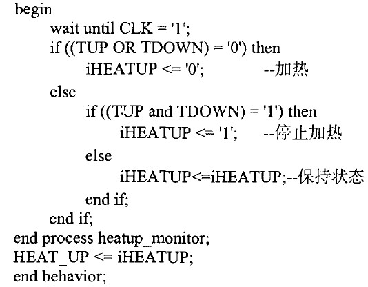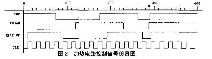 當(dāng)環(huán)境溫度低于0℃ ,此時TUP與TDOWN均為高電平,F(xiàn)PGA/CPLD輸出高電平HEAT_UP,加熱電路工作。當(dāng)環(huán)境溫度介于0℃與20℃之間時,如果此時正在加熱,則繼續(xù)加熱,如果當(dāng)前未加熱,則無需加熱。當(dāng)環(huán)境溫度高于20℃時,則停止加熱。