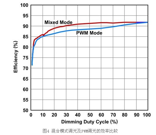 由于升壓轉(zhuǎn)換器須要提供較低的輸出電壓,因此輸入電源需求會降低并使效率提高(圖4)。在混合模式調(diào)光中,驅(qū)動器執(zhí)行D最低達(dá)到6.25%的模擬調(diào)光,接著轉(zhuǎn)換為PWM調(diào)光,以提高亮度線性。