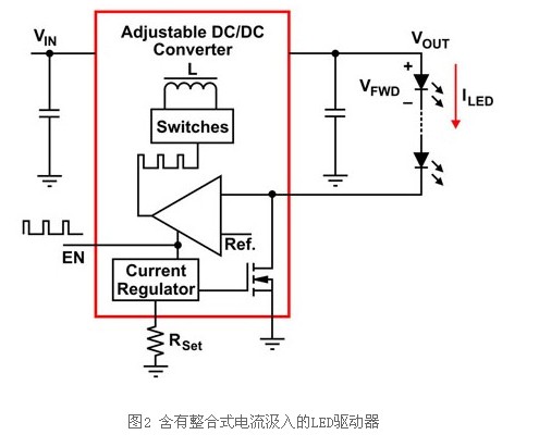 WLED亮度會隨著通過的電流而呈現(xiàn)直線變化,為使得各串行達(dá)到最佳的WLED電流準(zhǔn)確度及一致性亮度,LED驅(qū)動器應(yīng)調(diào)節(jié)通過LED的電流電壓,而非調(diào)節(jié)LED兩端的電流電壓。圖1顯示如何在輸出大于LED正向電壓的總和且電壓(VLED)下降情況下,重新設(shè)定任何可調(diào)整輸出的電流調(diào)節(jié)直流對直流(DC-DC)轉(zhuǎn)換器成為穩(wěn)定電源,以驅(qū)動串聯(lián)的多顆WLED。