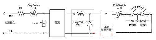 驅(qū)動(dòng)輸出上的PolySwitch組件有助于防止因有害短路或其他負(fù)載異常而受損,為了充分發(fā)揮PolySwitch組件的作用,可以與金屬芯電路板或LED散熱片熱接,此外,與LED并置的PESD組件也可以對(duì)靜電放電加以保護(hù)。