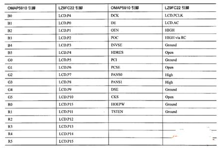 LZ9FC22和OMAP5910的LCD控制器連接,由于LZ9FC22是18位控制器(RGB信號各有6位),而OMAP5910的LCD控制器的輸出只有16位數(shù)據(jù),為此必須損失兩位數(shù)據(jù),將LZ9FC22的R0和BO接地,或者將R0和R5、BO和B5連接在一起。