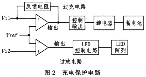 充電保護電路由兩個運算放大器組成,電路如圖2所示。圖2中Vi1、Vi2分別為蓄電池的輸出電壓,Vref為運算放大器的比較參考電壓,其具體值根據(jù)不同的要求由用戶設(shè)定。在實際設(shè)計過程中,要注意圖2中反饋電阻的選取,反饋電阻越大,控制輸出所對應(yīng)的輸入Vi回差值越小。