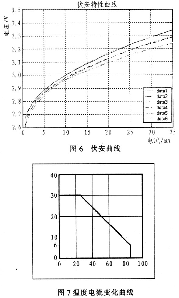 圖6和圖7分別為LED的伏安曲線和溫度電流曲線。由LED發(fā)光原理可以知道,白光LED的亮度變化主要是由其通電電流決定的。