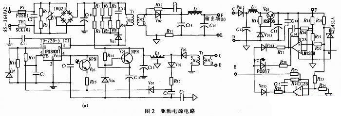 基于IRIS4011的電路由輸入保護(hù)電路,EMI抑制電路,輸入整流濾波電路,直流變換電路,輸出濾波電路,輔助供電電路,二次恒壓/恒流反饋電路組成。輸入電壓:85~264 VAC;輸入頻率47~63 Hz;輸出電壓5~24 VDC;輸出電流2.5 A;恒流精度±2.5%;最大輸出功率:60 W。利用變壓器的電感與瓷片電容實(shí)現(xiàn)準(zhǔn)諧振工作模式,電路簡單,可靠性高。準(zhǔn)諧振控制模式,能提高電路的轉(zhuǎn)換效率,降低EMI干擾。用放大器來實(shí)現(xiàn)恒壓、恒流控制,可以得到很高的控制精度。在輸出電流比較大的電路中,必須用放大器控制形式才能提高控制精度與提高電路轉(zhuǎn)換效率。限于篇幅,把電路圖分成2部分,具體的電路如圖2所示。