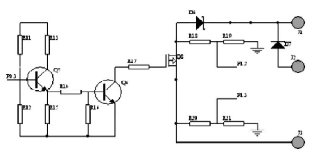 為了在夜間不同時刻采用不同的亮度,以達(dá)到節(jié)約電能的目的,本系統(tǒng)設(shè)計了兩路負(fù)載輸出,晚上12點(diǎn)以前兩盞LED皆亮,12點(diǎn)后一盞點(diǎn)亮,每路輸出均有立的控制和檢測。設(shè)計采用了PWM功率控制功能對LED燈具實現(xiàn)無級調(diào)光。單路原理如圖3所示。其中單片機(jī)P0.6 口給出控制信號, 即P 0 . 6 = 1 時, 三極管導(dǎo)通,繼電器閉合,MOS管導(dǎo)通,蓄電池向路燈供電。在電量不足或白天時,控制端輸出低電平信號,切斷供電回路。夜晚蓄電池電量不足情況下由市電供電系統(tǒng)給LED路燈供電,保證系統(tǒng)的完整和可靠。