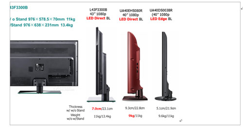 事實上,BMS模式對于品牌廠商而言并非完全出于成本考慮,而更側(cè)重于產(chǎn)品的差異化,以及品牌廠商將對渠道和消費者的理解體現(xiàn)在具體產(chǎn)品上,這對于提升品牌廠商終端產(chǎn)品競爭力而言至關(guān)重要。因此,我們可以發(fā)現(xiàn),從2010年起,幾乎所有一線品牌廠商新增的系統(tǒng)組裝產(chǎn)品均為BMS模式。以下為TCL在BMS模式下生產(chǎn)的直下式的LED電視在基本外觀尺寸上與Samsung最新推出的直下式產(chǎn)品對比。從相關(guān)的指標(biāo)來看,中國本土品牌在BMS一體化制造的能力已經(jīng)取得了非常大的進步,甚至領(lǐng)先一步。