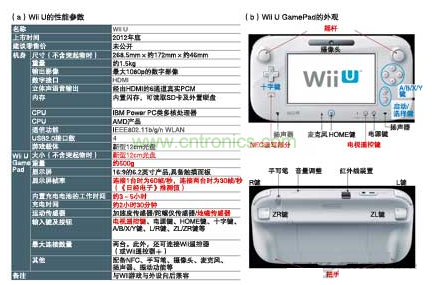 在E3上公開了Wii U的具體性能參數(shù)。例如,判明了平板型控制器“Wii U GamePad”的尺寸、重量及各種按鈕的配置等。另外,(b)的紅字部分指新追加或者大幅變更的部材,藍(lán)字部分指配置位置有很大變化的部材。