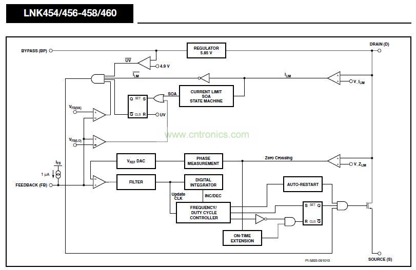 LinkSwitch-PL在一個(gè)器件上集成了一個(gè)高壓功率MOSFET開關(guān)及一個(gè)電源控制器。該IC器件提供單級(jí)功率因數(shù)校正和LED電流控制。LinkSwitch-PL控制器包括一個(gè)振蕩器、反饋(檢測(cè)及邏輯)電路、5.85 V穩(wěn)壓器、遲滯過熱保護(hù)、頻率抖動(dòng)、逐周期限流、環(huán)路補(bǔ)償電路、自動(dòng)重啟動(dòng)、開關(guān)導(dǎo)通時(shí)間延長、功率因數(shù)以及恒流控制電路。