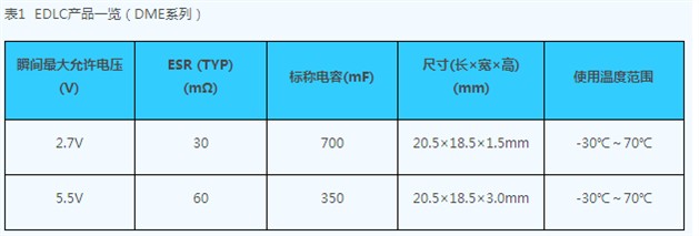表1為村田制作所的EDLC產(chǎn)品一覽,圖4為使用了村田EDLC的LEDflach演示板。這個系統(tǒng)能在33毫秒內向LED提供最大為8A的大電流。(可控制在2A-8A/10-60毫秒)