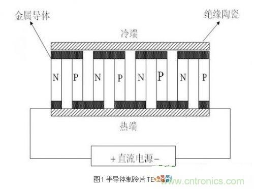 半導(dǎo)體制冷又稱電子制冷,或者溫差電制冷,是從50年代發(fā)展起來的一門介于制冷技術(shù)和半導(dǎo)體技術(shù)邊緣的學(xué)科,與壓縮式制冷和吸收式制冷并稱為世界三大制冷方式。半導(dǎo)體制冷器的基本器件是熱電偶對,即把一只N型半導(dǎo)體和一只P型半導(dǎo)體連接成熱電偶(如圖1),通上直流電后,在接口處就會產(chǎn)生溫差和熱量的轉(zhuǎn)移。在電路上串聯(lián)起若干對半導(dǎo)體熱電偶對,而傳熱方面是并聯(lián)的,這樣就構(gòu)成了一個常見的制冷熱電堆。借助于熱交換器等各種傳熱手段,是熱電堆的熱端不斷散熱并且保持一定的溫度,而把熱電堆的冷端放到工作環(huán)境中去吸熱降溫,這就是半導(dǎo)體制冷的原理。