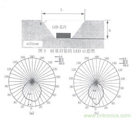 MEMS技術(shù)是隨著半導(dǎo)體和微電子技術(shù)的發(fā)展麗發(fā)展起來(lái)的一項(xiàng)新興的細(xì)微加工技術(shù),加工尺寸從毫米到微米數(shù)量級(jí),甚至亞微米的微小尺寸:其加T藝主要分為表面工藝和體工藝?;诠杌捏w工藝又稱為體硅工藝,體硅工藝呵以在硅基體上形成高深寬比的凹稽。由于MEMS的加工尺寸很小,因此利用該技術(shù)形成的微小凹槽作為L(zhǎng)ED芯片封裝的反射腔(如圖3),將會(huì)克服目前LED芯片直接封裝在PCB板上而引起發(fā)光效率低的問(wèn)題;同時(shí)由于硅具有良好的導(dǎo)熱特性,因此可以降低目前封裝中熱阻高的問(wèn)題,從而提高LED芯片的發(fā)光效率和可靠性。圖4(a)和(b)給出了當(dāng)LED芯片直接貼裝在PCB板上和貼裝在有凹槽的硅基上的發(fā)光特性。從圈中可以看出,LED貼裝在帶有凹槽的硅基上以后其發(fā)出光的發(fā)散性能得到了很大的改善,LED的發(fā)光強(qiáng)度提高了75%以上。
