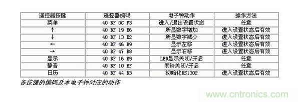 遙控器采用長虹彩電K11F型遙控器,遙控器按照16位地址碼,8位數(shù)據(jù)碼以及8位數(shù)據(jù)碼的反碼發(fā)送。表一列出了各按鍵的編碼及本電子鐘對(duì)應(yīng)的動(dòng)作。如果采用其他遙控器,需對(duì)程序相應(yīng)部分的編碼作修改。