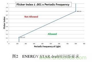 化,人眼到人腦對(duì)這一變化產(chǎn)生的主觀反映。通常閃爍按人的感覺(jué)分為可見(jiàn)閃爍和不可見(jiàn)閃爍。頻率大于100Hz時(shí),人眼感受不到閃爍現(xiàn)象,但仍會(huì)造成眼睛疲勞,頭痛等,這就是頻閃效應(yīng)。普遍認(rèn)為500Hz以?xún)?nèi)都存在該效應(yīng)。對(duì)此,美國(guó)能源之星在調(diào)光性能的要求中規(guī)定了閃爍需滿(mǎn)足的條件,使用于所有燈具。如下圖所示:
