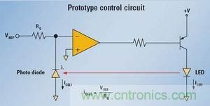 【導讀】在利用光來控制應用的過程中,要長期保持原始設定的發(fā)光強度需要一個控制電路來監(jiān)控發(fā)光狀況,并控制供給光發(fā)射器件的電流以保持輸出恒定。而采用一個簡單的運算放大器電路就做到,即便發(fā)光器件老化,通過調整LED電流,一個控制環(huán)也可維持恒定的光強度。