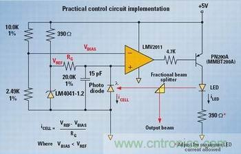 VBIAS由兩個精度為1%的電阻產生,電壓值設定為約1V。VREF和VBIAS之間的差值除以RG,就可得出控制環(huán)封閉的光電二極管電流。要注意的是,VBIAS須小于VREF,否則電路不能工作。如果光電二極管電流為10mA,那么RG應該為0.2×10E-6或20.0k。