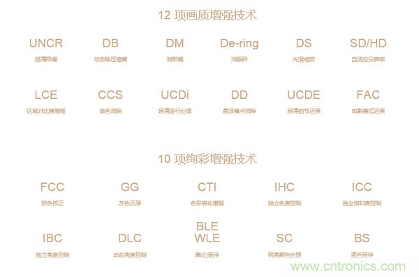 當(dāng)然,它也關(guān)畫質(zhì)有那么一點(diǎn)事。因?yàn)榇蟛糠值碾娨旳RM芯片也都集成了畫質(zhì)引擎技術(shù),比如下圖所出現(xiàn)的,有百分之九十的人都不會(huì)看完的各種高大上的技術(shù)術(shù)語(yǔ)。不要以為這些技術(shù)很牛,是電視廠商搞出的什么新鮮玩意兒,其實(shí)這只是一個(gè)多合一芯片集成了所有的接口,也就是說(shuō)只要是同一芯片方案的電視機(jī)連底層程序都是一樣的,沒有絲毫的獨(dú)特性。