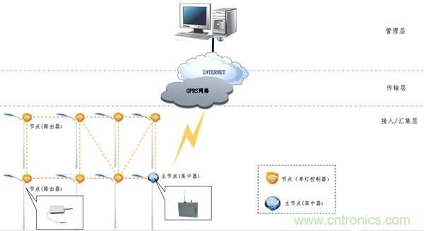 下行:通過zigbee無線方式和控制節(jié)點(單燈)通信;上行:通過GPRS等方式與監(jiān)控中心通信;