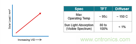 為了更好地理解為什么散射屏具有優(yōu)勢(shì),我們不妨來(lái)看看散射屏與傳統(tǒng)TFT面板的物理特性(圖4)。散射屏具有的兩大主要優(yōu)勢(shì)在于可在更高的溫度中工作,此外散射屏不會(huì)吸收大量的太陽(yáng)入射可見(jiàn)光譜,這一點(diǎn)更加重要。(光譜的紅外[IR]和紫外[UV]部分很容易被過(guò)濾。)