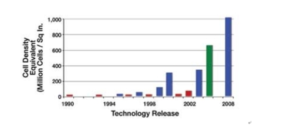圖2顯示了Fairchild公司≤30V的N溝道MOSFET單元密度的進(jìn)步。每個(gè)條形都表示新的工藝進(jìn)步??梢钥吹?,在最近的十年中,單元密度從3200萬(wàn)單元/平方英寸增加到現(xiàn)在的10億單元/平方英寸。