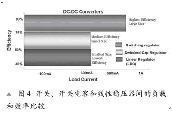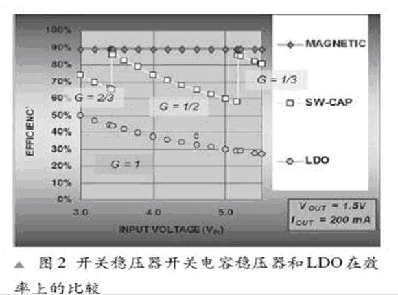 隨著VIN的增長,由轉換器產(chǎn)生的VIN和VOUT 間的增量增長引起功率消耗的增長和效率的下降。解決這個問題的一個方式是轉變成一個更高的效率增益,就像給汽車替換齒輪一樣。圖2顯示了一個開關電容器降壓穩(wěn)壓器,一個LDO及一個開關電容器的效率曲線。開關電容器具有一個模擬增益控制和增益變化以保持一個給定負載效率的持續(xù)性。開關電容器并具有離散增益步驟,由VOUT/(增益 *VIN)與離散增益來決定效率的高低。一個LDO僅有1的增益及三者中最低的效率。開關電容器(SC)穩(wěn)壓器則有三個不同的電壓增益(2/3,1/2和1/3)。我們可以看到,開關電容穩(wěn)壓器隨著VIN 的增長,電壓增益從2/3轉到1/2以及從1/2到1/3,因此整個負載范圍的效率達到最大化。這就帶來了在Li-ion 范圍上(3.4V到3.8V)80%的效率。在相同應用中的一個LDO僅能達到50%的效率。根據(jù)電感器種類,一個典型的開關穩(wěn)壓器大約具有88-90%的效率。